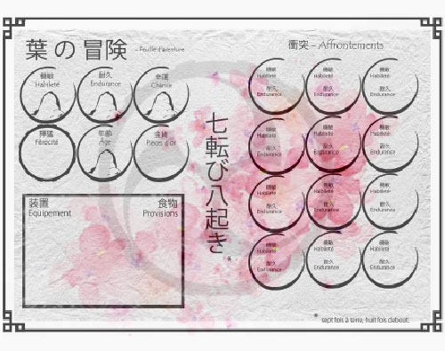 Depuis début 2021 je suis dans une phase très japonaise, j'ai même débuté l'apprentissage balbutiant du japonais. Je me suis donc tourné vers ma collection de LDVELH pour chercher les histoires dans ce ton. LE DF n°47 est de ceux-là. Outre traduire les mots en kanjis, j'ai ajouté un môn en fond (un blason japonais), les sempiternelles fleurs de cerisiers qui symbolisent le temps qui passe, et enfin la citation qui m'accompagne depuis des années "Sept fois à terre, huit fois debout" qui se traduit li'tarlement par "Sept fois échouer, huit fois recommencer", et qui je trouve colle parfaitement avec le concept des LDVELH